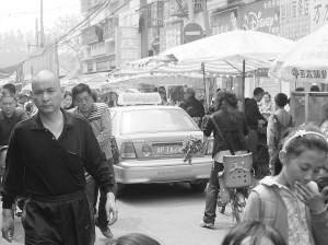 記者在育新街與六一路交叉口看到,路口的許多商販都把商品直接擺放在行車(chē)道上,有人站在街上與小販討價(jià)還價(jià),自行車(chē)、電動(dòng)車(chē)就橫七豎八地停在馬路上。站在路口往南看,高懸的禁行標(biāo)志下,剛好停了一輛綠色的出租車(chē),本來(lái)就不寬的馬路被占去一半。