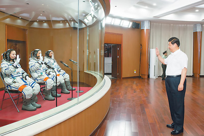 聶海勝代表3名航天員鄭重表示,感謝習(xí)主席,感謝黨和人民的關(guān)懷。我們一定服從命令,聽從指揮,沉著冷靜,精心操作,圓滿完成神舟十號(hào)任務(wù)。請(qǐng)首長放心,請(qǐng)祖國和人民放心。