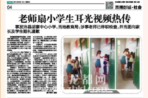 在等待調(diào)查結(jié)果的同時,記者通過網(wǎng)絡(luò)積極尋找與該視頻相關(guān)的信息。9月12日17時許,記者在當(dāng)天的《彭城晚報》上看到一則標(biāo)題為《老師扇小學(xué)生耳光視頻熱傳》的消息,報紙上刊登的圖片為視頻中的截圖。據(jù)報道,該事件發(fā)生在江蘇省徐州市沛縣胡寨中心小學(xué)。9月9日7時30許,胡寨中心小學(xué)老師吳某對沒有完成作業(yè)的3名學(xué)生進(jìn)行體罰,后被人舉報。目前,涉事學(xué)校和老師已向家長和學(xué)生賠禮道歉。