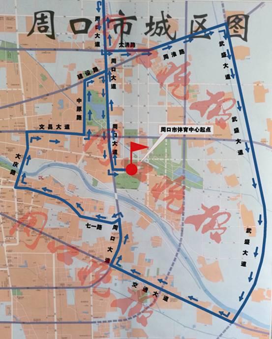????賽事初步確定報(bào)名參賽總?cè)藬?shù)為1萬人,其中,全程馬拉松2000人,半程馬拉松2000人,迷你馬拉松6000人。比賽路線(如圖)暫定為:市體育中心(起點(diǎn))——周口大道——北高速口轉(zhuǎn)折——太清路——周淮路——武盛大道——周項(xiàng)路——周口大道——七一路——大慶路——文昌大道——中原路——建設(shè)路——周口大道——市體育中心(終點(diǎn))。