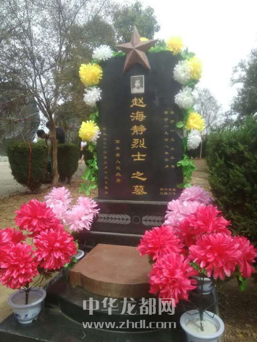 ????2015年10月,周口市鹽業(yè)局干部康國富和胡東周受市委組織部指派,到商水縣鄧城鎮(zhèn)周莊村駐村。2016年3月,康國富和胡東周在村里召開黨員大會時,偶然了解到趙海靜的事跡,深受感動。他們經過調查、走訪,確認了趙海靜烈士的事跡。于是,他們先后向周口市委組織部、商水縣委組織部有關領導作了匯報,懇請有關部門為趙海靜修墓立碑。他們的請求得到了市縣兩級組織部門的大力支持,鄧城鎮(zhèn)民政所和商水縣民政局聞訊后也積極配合。