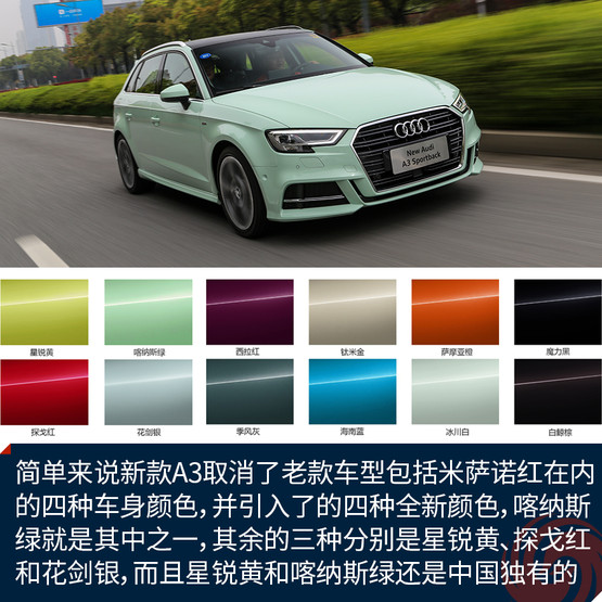 先來(lái)說(shuō)說(shuō)喀納斯綠到底是什么顏色吧。簡(jiǎn)單來(lái)說(shuō)新款A(yù)3取消了老款車型包括米薩諾紅在內(nèi)的四種車身顏色,并引入了的四種全新顏色,喀納斯綠就是其中之一,其余的三種分別是星銳黃、探戈紅和花劍銀,而且星銳黃和喀納斯綠還是兩種中國(guó)市場(chǎng)獨(dú)有的顏色。如果說(shuō)這個(gè)顏色看上去像什么,我覺(jué)得大概像是哈密瓜冰激凌,或者是綠色的奶油,反正給我一種清新又甜蜜的錯(cuò)覺(jué)。