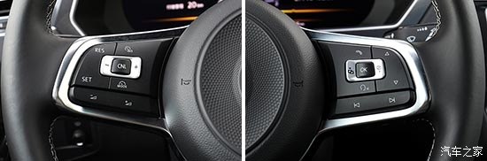 三輻式真皮方向盤造型與國(guó)產(chǎn)版本存在一定差異,中間部分采用圓形設(shè)計(jì),且邊緣鑲嵌帶有R-Line標(biāo)識(shí)的銀色飾條,視覺(jué)效果更加動(dòng)感、精致。方向盤圈輻偏細(xì),好在真皮材質(zhì)較為細(xì)膩,握感更趨向舒適,而下方采用平底造型,能夠?yàn)轳{駛員營(yíng)造更充足的腿部空間。除了常見的音量調(diào)節(jié)和行車電腦切換等功能外,背面還帶有換擋撥片,“不幸”的是,Tiguan的變速箱天資聰慧,用到它的幾率比較有限。
