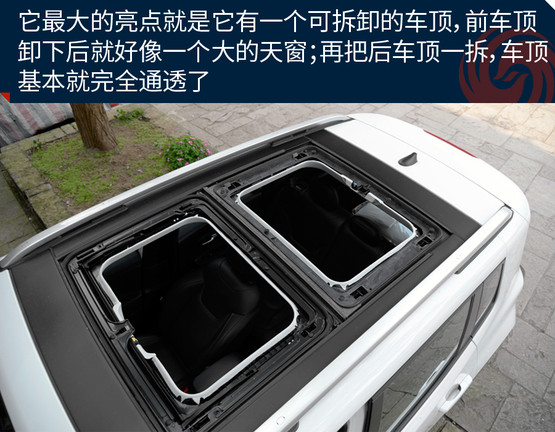 敞篷版車型將普通車型的天窗玻璃全部換成了可拆卸的頂棚,拆卸過程十分方便,即使是女性車主也能輕松拆卸。而且最重要的一點(diǎn)是這個(gè)頂棚不只是樣子貨,平時(shí)放在車頂時(shí),車內(nèi)可進(jìn)行操作,把它變成一個(gè)電動天窗來用,是不是感覺特高端?