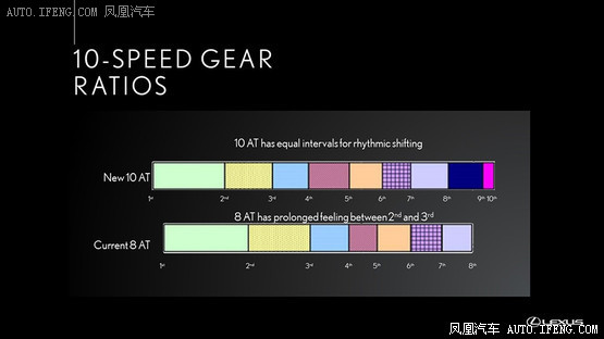 與發(fā)動(dòng)機(jī)匹配的就是世界上首款10速自動(dòng)變速器,這款變速器是在8檔變速器的二擋和三擋之間增加一個(gè)齒比擋位,全部10擋之間保持均勻的齒比間隔,換擋節(jié)奏感十分強(qiáng),而且換擋時(shí)間僅為0.2秒,已經(jīng)達(dá)到雙離合變速器的水準(zhǔn)。