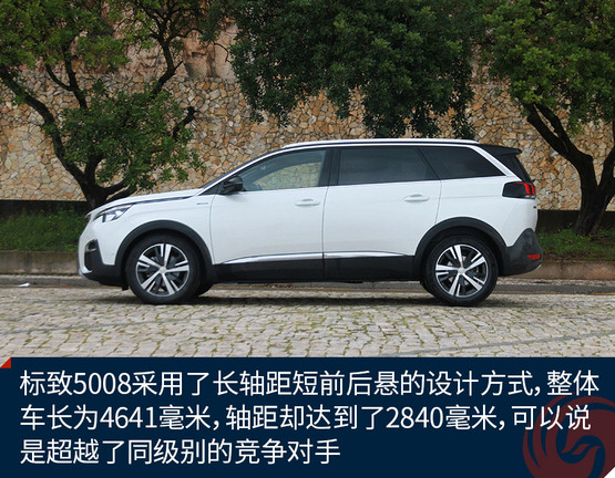 和市面上的一些7座SUV不同,標致5008采用了長軸距短前后懸的設計方式,這樣的設計更多的出現在運動派車型上。標致5008的整體車長為4641毫米,軸距卻達到了2840毫米,可以說是超越了同級別的競爭對手。
