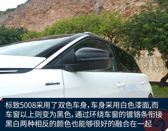 標致5008采用了雙色車身,比如我們試駕的這一輛GT-Line版車型,車身整體采用白色漆面,而車窗以上的部分則變?yōu)楹谏ㄟ^環(huán)繞車窗的鍍鉻條銜接,黑白兩種相反的顏色也能夠很好的融合在一起。