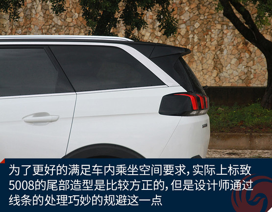 為了更好的滿足車內乘坐空間要求,實際上標致5008的尾部造型是比較方正的,但是設計師通過線條的處理巧妙的規(guī)避這一點。側窗鍍鉻裝飾在尾部快速下滑與尾燈相連接,上面后窗的部分則用黑色處理,使得標致5008的視覺效果仍然充滿動感,同時還保留了第三排空間的實用性。