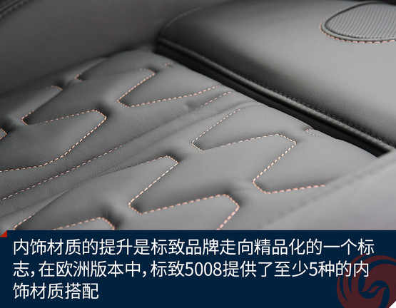 內飾材質的提升是標致品牌走向精品化的一個標志,在歐洲版本中,標致5008提供了至少5種的內飾材質搭配,比如我們試駕的這款GT-Line版本,就采用布與皮相結合的材質選擇,座椅則采用了標致最新的經典紋路,既美觀又保證乘坐舒適性。