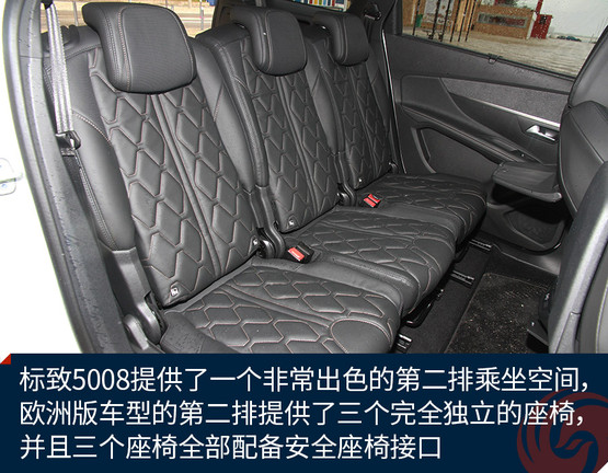 作為一款7座中型SUV,標致5008最受關注的一點就是車內空間的體驗了,這里我就來多講一講。首先,標致5008提供了一個非常出色的第二排乘坐空間,不夸張的說2840毫米的軸距基本上就是在為第二排乘客服務的。歐洲版車型的第二排提供了三個完全獨立的座椅,并且三個座椅全部配備安全座椅接口,而國產車型將會改為4/6分隔的座椅類型。