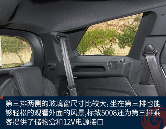 不過第三排也有值得表揚的地方,首先正如前面所說,由于車身設計的比較方正,所以第三排的頭部空間比較理想,并不覺得特別頂頭;另外,第三排兩側的玻璃窗尺寸比較大,坐在第三排也能夠輕松的觀看外面的風景;最后,標致5008還為第三排乘客提供了儲物盒和12V電源接口,能夠滿足基本的使用需求。