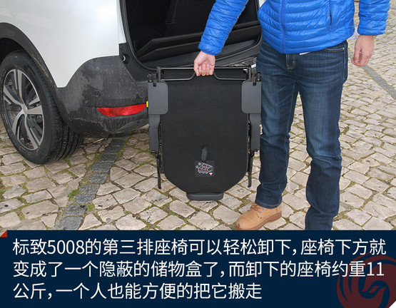 此處還有一個小Tips:標致5008的第三排座椅可以輕松卸下,座椅下方就變成了一個隱蔽的儲物盒了,而卸下的座椅約重11公斤,一個人也能方便的把它搬走。