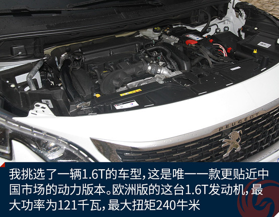 所以我挑選了一輛1.6T的車型,這是唯一一款更貼近中國市場的動力版本。歐洲版的這臺1.6T發(fā)動機,最大功率為121千瓦,最大扭矩240牛米,大概相當于國內標致4008 1.6T的350THP版本。