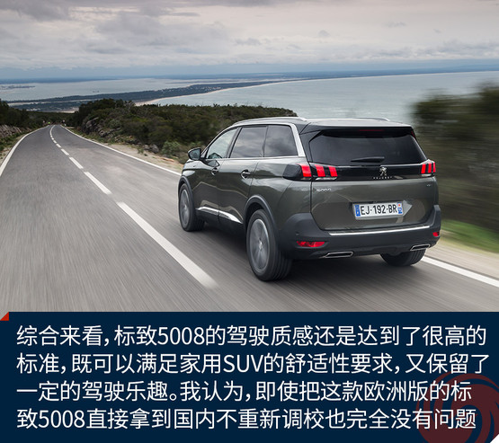綜合來看,標致5008的駕駛質感還是達到了很高的標準,既可以滿足家用SUV的舒適性要求,又保留了一定的駕駛樂趣。我認為,即使把這款歐洲版的標致5008直接拿到國內不重新調校也完全沒有問題。