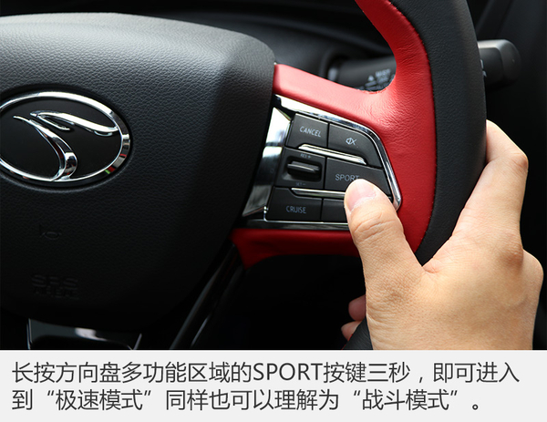 此次DX3 SRG在原有的運(yùn)動(dòng)模式外,還新增了“極速競(jìng)技模式”同時(shí)開(kāi)啟方法也很簡(jiǎn)單,只需要長(zhǎng)摁方向盤右側(cè)的SPORT按鍵三秒,這時(shí)儀表板會(huì)由白色背光變成紅色,表示已經(jīng)進(jìn)入該模式。