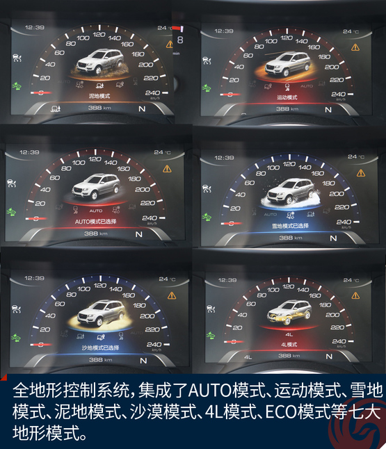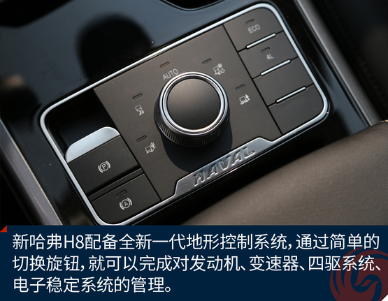 ????????四驅(qū)系統(tǒng)也是新哈弗H8的亮點,搭載全新一代全地形控制系統(tǒng),可使駕駛者簡單的旋轉(zhuǎn)旋鈕,切換駕駛模式,這套系統(tǒng)集成了7大不同的駕駛模式。讓駕駛者可以輕松面對各種復雜的路況,這套系統(tǒng)的目的就是把復雜的操作簡單化。