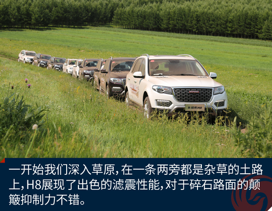 ????????經(jīng)過一段輕度的草原穿越,這段路程主要是體驗H8的通過性和濾震性能,好戲才剛剛開始,通過這段路程我已經(jīng)感受出了H8偏向城市型SUV的調(diào)教,底盤很穩(wěn)健,但是懸掛比較硬朗。