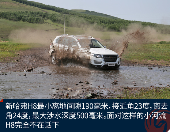 ????????涉水測試對于新哈弗H8來說簡直是小菜一碟,190mm的離地間隙,500mm的最大涉水高度,這條小河完全阻擋不了H8的腳步。俗話說“緊走沙,慢走水”是對于路況不清楚的水域,萬一進氣系統(tǒng)進水,發(fā)動機就會熄火。所以一定要小心涉水深度。像我們這么莽撞的壓水花,是在水域已經(jīng)探明的情況下。