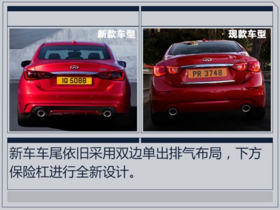 全新英菲尼迪Q50對外觀進行了調(diào)整,前臉采用上下分體式格柵設(shè)計,上格柵為網(wǎng)狀造型,保險杠下唇為碳纖維材質(zhì)。車尾取消了車牌下方鍍鉻飾條以及兩側(cè)反光板,下方保險杠換裝黑紅雙色護板。
