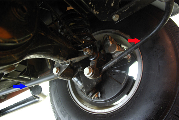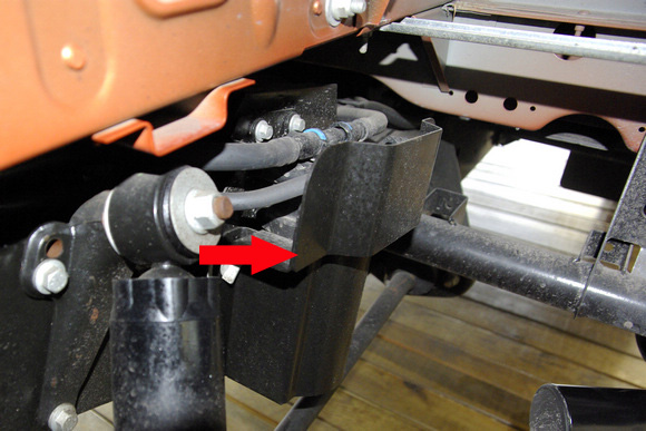 ????細(xì)節(jié)處,剎車(chē)的油管外側(cè)有護(hù)板(箭頭處)進(jìn)行周全保護(hù),有效杜絕越野時(shí)由車(chē)輪攪入的尖銳物體劃傷油管。