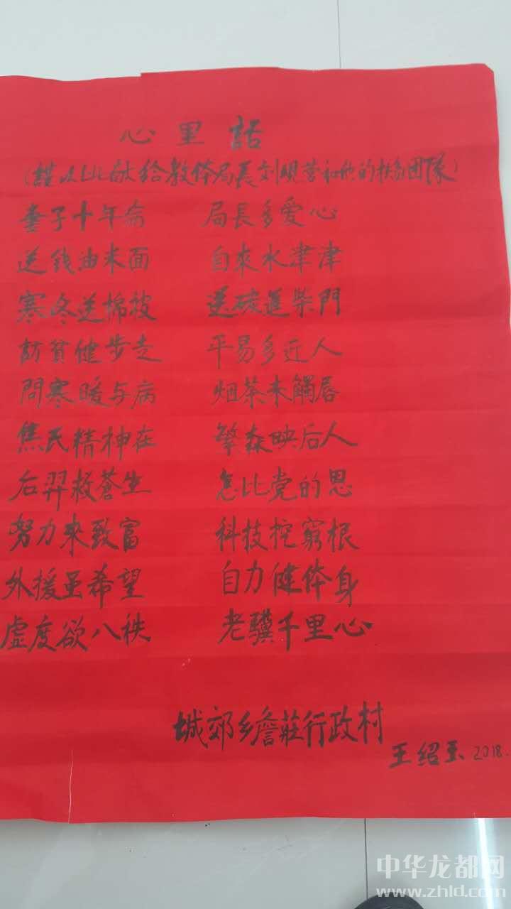 “我推敲了幾個(gè)半夜,寫(xiě)了《心里話(huà)——謹(jǐn)以此獻(xiàn)給教體局局長(zhǎng)劉現(xiàn)營(yíng)和他的扶貧團(tuán)隊(duì)》這首五言排律,表表我和老伴及全村對(duì)您的感激之情?!薄捌拮邮瓴?,局長(zhǎng)多愛(ài)心。送錢(qián)米油面,自來(lái)水津津。寒冬送棉被,送炭至柴門(mén)。訪(fǎng)貧健步走,平易又近人?!蓖踅B玉聲情并茂地朗讀著,劉局長(zhǎng)爽朗地笑了,“老伴劉桂蘭藥按時(shí)吃了嗎?”“按時(shí)吃了,多虧您,到我家宣講扶貧政策,幫助我聯(lián)系有關(guān)單位,我老伴享受了慢性病醫(yī)保?!薄肮鹛m說(shuō),人家劉局長(zhǎng)隔三差五給咱送米面油,逢年過(guò)節(jié)給咱送慰問(wèn)金,前幾天頂風(fēng)冒雪送來(lái)兩床被子,一年不知來(lái)了多少趟,待咱比親人還親??!我家也沒(méi)有什么拿出手的,我倆一合計(jì),就發(fā)揮我的一點(diǎn)專(zhuān)長(zhǎng),給您寫(xiě)了首詩(shī),您經(jīng)常去我家噓寒問(wèn)暖,我今個(gè)也來(lái)您這,算是走走親戚吧,回報(bào)回報(bào)您!”