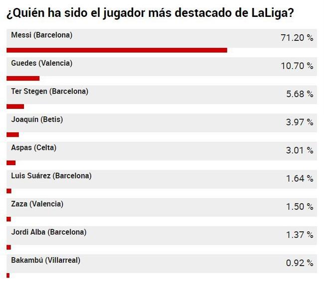 對(duì)于西甲半程最佳球員的投票,有高達(dá)71.2%的球迷將票投給了梅