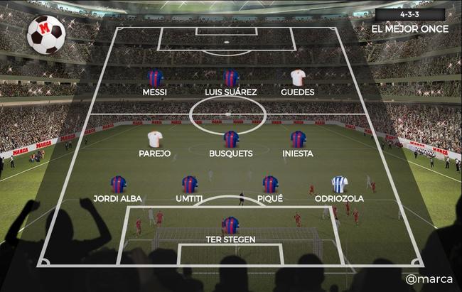 在球迷票選的西甲半程最佳11人中,巴薩占據(jù)了8席:特爾施特根、阿爾巴、烏姆蒂蒂、皮克、布斯克茨、伊涅斯塔、梅西和蘇亞雷斯都入選了這個(gè)陣容。