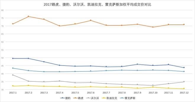凱迪拉克、捷豹路虎、雷克薩斯、沃爾沃四個(gè)品牌銷量在10萬(wàn)輛以上為第二陣營(yíng)。除路虎外,捷豹因進(jìn)口F-pace帶動(dòng)其成交價(jià)上揚(yáng),隨著XE國(guó)產(chǎn)上市銷售,捷豹銷量有望進(jìn)一步增長(zhǎng),價(jià)格進(jìn)一步下探;以銷售進(jìn)口車型為主的雷克薩斯,今年銷量質(zhì)量不錯(cuò),庫(kù)存時(shí)間短,資金周轉(zhuǎn)快,多數(shù)以訂單方式銷售,加權(quán)平均價(jià)在42萬(wàn)上下,成交價(jià)格走勢(shì)平穩(wěn),經(jīng)銷商今年利潤(rùn)也很豐厚。沃爾沃在新款車型的帶動(dòng)下,成交價(jià)格開始上揚(yáng);凱迪拉克今年銷量增速較快,通過(guò)下圖我們可以看到,凱迪拉克基本依靠低價(jià)獲取銷量的增長(zhǎng),成交價(jià)格進(jìn)一步走低,經(jīng)銷商的利潤(rùn)需要依靠廠家補(bǔ)貼。