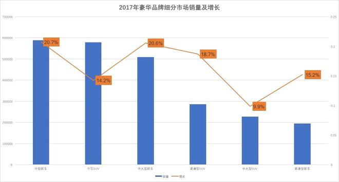 2017年豪華車市場(chǎng)中六大細(xì)分市場(chǎng)(中大型轎車、中型轎車、緊湊型轎車、中大型SUV、中型SUV、緊湊型SUV)占據(jù)豪華車全年93%的銷量,環(huán)比增長(zhǎng)17.3%,市場(chǎng)集中度進(jìn)一步提升;豪華車企業(yè)如果想與市場(chǎng)同步增長(zhǎng),就不得不在這個(gè)六個(gè)細(xì)分市場(chǎng)投放車型,并提升產(chǎn)品競(jìng)爭(zhēng)力。