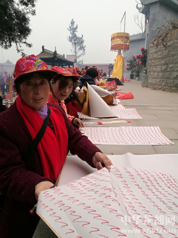 大霧的確延緩了香客的腳步,這也讓晚來的記者得以看到祭拜的盛景。女媧陵前,十幾名身著統(tǒng)一緞面紅襖,穿黑棉布鞋的女客正在結(jié)伴焚香祭拜,口音明顯和當?shù)厝瞬煌?。她們是從距西華300多公里的濮陽范縣、臺前縣來的,說是凌晨2時就起身出發(fā),大霧中不僅遭遇堵車,還迷了路,到女媧城都快8時了。她們這次一起來的有30多人,分乘4輛車。就像往常前來一樣,她們在女媧城要焚香、跪拜、“寫賬”(在紙上畫符,敬奉女媧的一種民間形式)、“守功”(在大殿靜坐,以示對女媧親近),直至下午方回?!拔覀兠磕炅鲁跻缓团D月初一都來,為啥?信奉女媧娘娘唄,不來不舒服。”其中一位孔姓香客告訴記者。