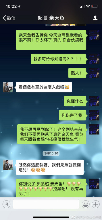 黃子韜12日在微博上分享一張與郭品超的對(duì)話截圖,并在發(fā)文中生氣地寫道:“什么都不用說(shuō)了!拉黑吧!”他似乎是在看了最新播出的2集《談判官》后,為自己劇中的遭遇感到憤憤不平,立刻找郭品超算賬直呼:“親天魚(yú)(秦天宇,郭品超劇中角色)我告訴你,今天這兩集我看的很不爽!你太壞了,真的,你合伙搞我。我多可憐你知道嗎?!賤人!”