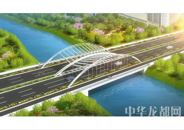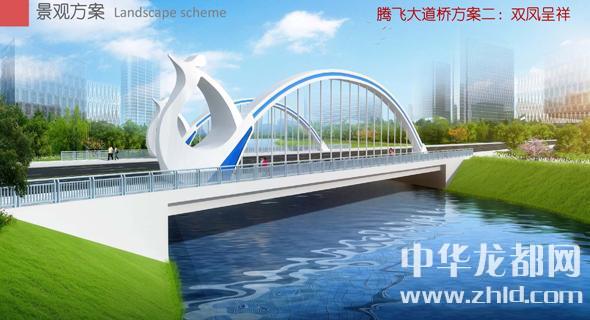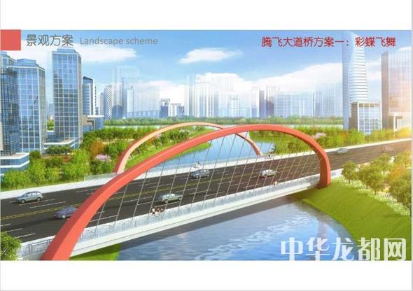 騰飛大道橋的設(shè)計方案有兩套,分別為“彩蝶飛舞”和“雙鳳呈祥”?!安实w舞”為下承式鋼管拱橋,寬36米。記者從效果圖中看到,橋兩側(cè)的拱圈,極具色彩感,給人一種賞心悅目的感覺?!半p鳳呈祥”為裝飾鋼管拱橋,寬36米。該橋采用“雙鳳”造型,象征天下太平,富含吉祥之意。