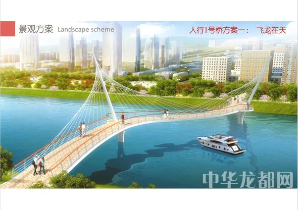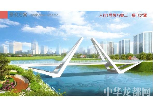 人行1號橋的設(shè)計方案有兩套,分別為“飛龍在天”和“騰飛之翼”?!帮w龍在天”為雙塔斜拉橋。記者從效果圖中看到,該橋呈現(xiàn)出優(yōu)美的線條,宛如一條長龍騰空在天?!膀v飛之翼”為V腿連續(xù)鋼箱梁橋。記者從效果圖中看到,橋體簡潔流暢,時尚現(xiàn)代,橋墩形成穩(wěn)固的三角形,像兩只燕子展翅高飛。