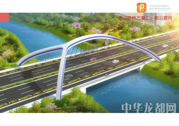 泰山路橋的設(shè)計方案有兩套,分別為“錚錚鐵骨”和“梳云掠月”?!板P錚鐵骨”為下承式系桿拱橋。記者從效果圖中看到,其拱體骨架給人一種力量感,拱身視線通透,簡潔明快?!笆嵩坡釉隆睘殇摻罨炷撂峄@拱橋。記者從效果圖中看到,該橋的拱圈造型獨特,簡潔又不失大氣。