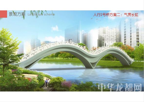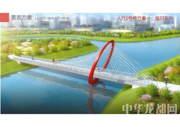 人行2號橋的設(shè)計方案有兩套,分別為“旭日東升”和“氣貫長虹”?!靶袢諙|升”為圓形塔懸索橋。記者從效果圖中看到,該橋的橋塔為圓形,猶如一輪東升的太陽,象征著城鄉(xiāng)一體化示范區(qū)蓬勃發(fā)展的未來?!皻庳為L虹”為中承式系桿拱橋。該方案結(jié)合中國玉帶橋的古典元素、抽象古典幾何美學(xué),采用現(xiàn)代的設(shè)計手法,創(chuàng)作出現(xiàn)代感和中國傳統(tǒng)橋梁元素雜糅的橋梁設(shè)計。