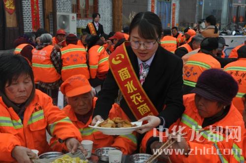 春節(jié)以來(lái),城區(qū)人口增加,環(huán)衛(wèi)工人工作量大增,許多工人吃不上應(yīng)時(shí)熱飯。為感謝環(huán)衛(wèi)工人的辛苦工作,愛心企業(yè)商水農(nóng)商行精心為當(dāng)日值班的環(huán)衛(wèi)工作提供了免費(fèi)午餐,并為每位環(huán)衛(wèi)工作提供了一份精美禮品?!吧显耍 辈穗壬蠅蚴畟€(gè),農(nóng)商行工作人員端上來(lái)大盆元宵?!袄哿艘簧衔?,能在這和大家一道過元宵佳節(jié),真是太感謝農(nóng)商行的領(lǐng)導(dǎo)!”65歲的環(huán)衛(wèi)工人趙明亮吃著甜滋滋的元宵高興地說。