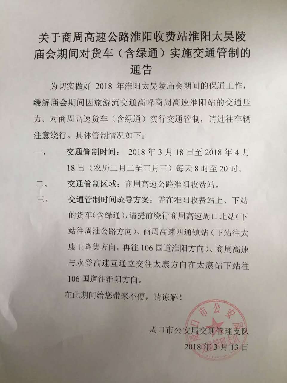 中華龍都網訊(周口報業(yè)全媒體記者 侯俊豫)3月13日,市交警支隊發(fā)布通告稱,為做好2018年太昊陵廟會期間的保通工作,緩解廟會期間商周高速淮陽站的交通壓力。對商周高速貨車(含綠通)實行交通管制,請過往車輛注意繞行?,F對商周高速貨車(含綠通)實行交通管制: