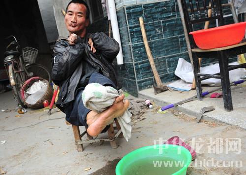“這孩子40多年來(lái),沒(méi)住過(guò)院,沒(méi)打過(guò)針,頭疼發(fā)燒會(huì)給媽媽示意,拿幾片藥一吃就好,這孩子命硬,一冬天也不洗回澡,到夏天爸爸媽媽幫他洗洗,有時(shí)候衣服一月才換一次?!编従訌埓髬屨f(shuō)道?,F(xiàn)在紅印可以靈活的用雙腳幫媽媽做一些事情了。