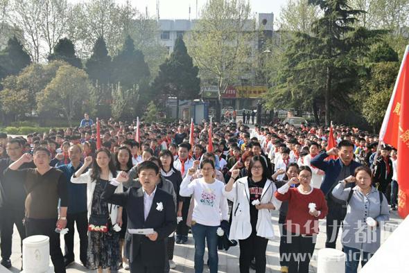 上午八點(diǎn)半,400余名學(xué)生衣著整潔,佩戴紅領(lǐng)巾,手握自備白花,排著整齊的隊(duì)伍從學(xué)校出發(fā),懷著對烈士無限崇敬的心情來到周口烈士陵園,佇立在傲然聳立的烈士紀(jì)念碑前,莊嚴(yán)肅穆的悼念活動(dòng)開始了。升國旗、唱國歌、敬隊(duì)禮,黨員教師在烈士紀(jì)念碑前重溫入黨誓詞,少先隊(duì)員代表向烈士墓敬獻(xiàn)花圈,全體師生向烈士鞠躬默哀。