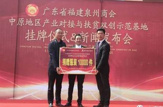 儀式上,廣東省福建泉州商會與香港磊磊集團(tuán)捐贈服裝10000件,用于啟動扶貧商店。與會領(lǐng)導(dǎo)共同為“廣東省福建泉州商會中原地區(qū)產(chǎn)業(yè)對接與扶貧雙創(chuàng)示范基地”揭牌。隨后,與會人員共同到潤泰紡織、盛宏紡織、萬利源棉業(yè)等企業(yè)進(jìn)行了參觀,并召開了廣東省福建泉州商會中原地區(qū)產(chǎn)業(yè)對接與扶貧雙創(chuàng)示范基地產(chǎn)業(yè)對接論證座談會。