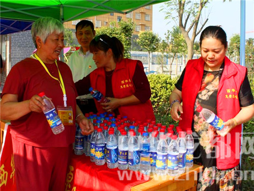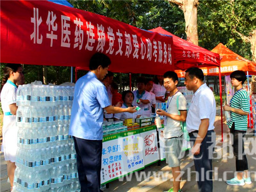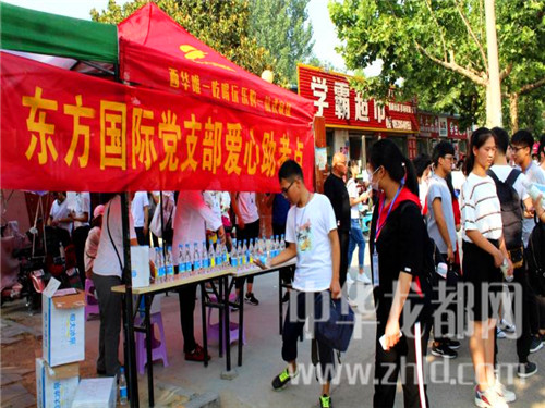 愛心助考活動現(xiàn)場,西華縣真愛醫(yī)院黨支部設(shè)立的“黨旗引領(lǐng)、護航高考”的大紅愛心助考條幅分外惹眼,黨員志愿者們免費為考生提供藿香正氣水、風油精、退燒藥等,并有醫(yī)護人員現(xiàn)場提供急救服務。在西華縣恒生醫(yī)院黨支部愛心助考點前,3名醫(yī)護人員正在免費為考生及家長提供風油精、清涼油、仁丹、藿香正氣水等防暑降溫藥品和急救藥品,還有擔架、120急救車輛等。西華縣北華醫(yī)藥黨支部愛心助考服務站的黨員志愿者,正在向考生免費提供防暑降溫藥、感冒發(fā)燒藥、拉肚子藥等藥品。黨員志愿者愛心企業(yè)代表宋女士說:“在高考期間,我們?yōu)榭忌凹议L免費提供礦泉水、芭蕉扇、清涼油等多項服務,除了愛心,更多的是一份責任和使命?!?/p>
