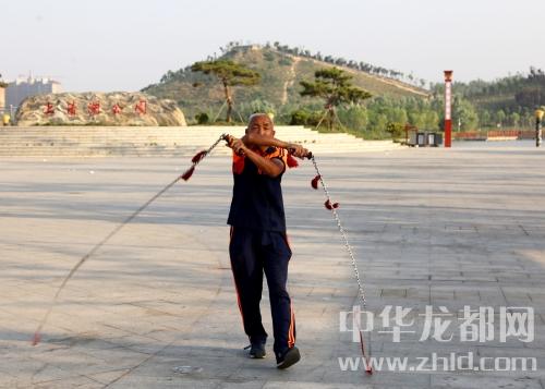 記者在現(xiàn)場(chǎng)看到,切磋技藝的人群中,有甩單鞭、雙鞭的,也有短鞭和長(zhǎng)鞭的。鞭友牛紅力起60公斤的大鐵鞭虎虎生威,贏得現(xiàn)場(chǎng)觀眾的喝彩;70多歲的李老漢起雙鞭滾打、跳打花樣十足,一套完整的老子騎牛鞭讓人眼花繚亂,贏得陣陣掌聲。