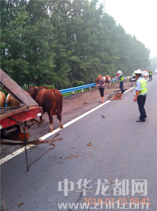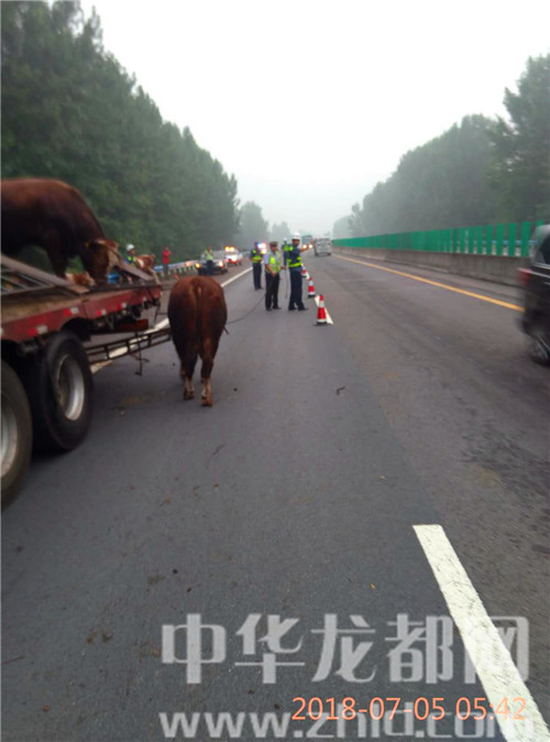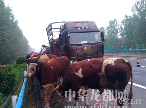 中華龍都網(wǎng)訊(周口報(bào)業(yè)全媒體記者 姬慧洋 通訊員 劉杰 文/圖)“在大廣高速2025公里西半幅附近發(fā)生一起單方事故,幾十頭牛散落在路面,請求處警。”7月5日5時許,周口市公安局交通管理支隊(duì)高速二大隊(duì)扶溝中隊(duì)接到110指令稱。