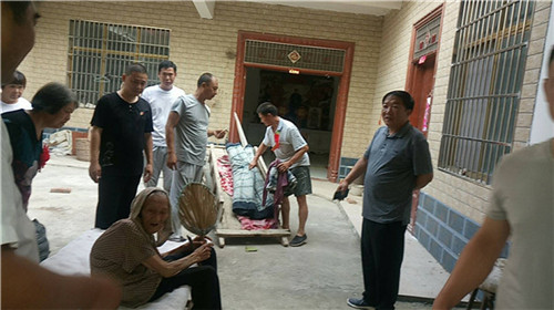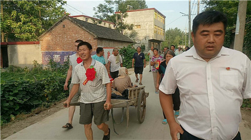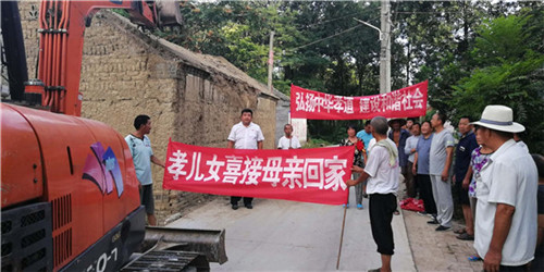 當(dāng)日早上,秋渠鄉(xiāng)高小橋行政村牛橋和孫大莊自然村,鄉(xiāng)村干部打著橫幅、孝順兒、媳胸帶紅花,用架子車?yán)先?,后面跟著圍觀的村民,通過隆重“接老人回家”活動(dòng),激勵(lì)更多人孝老愛親。