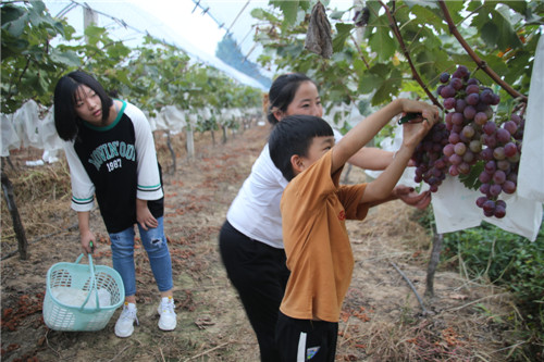 近日,商水縣鄧城鎮(zhèn)天力生態(tài)葡萄園的葡萄大面積成熟,因種類多、口感好,前去采摘的市民絡繹不絕。圖為9月1日幾名市民在園內(nèi)采摘葡萄。