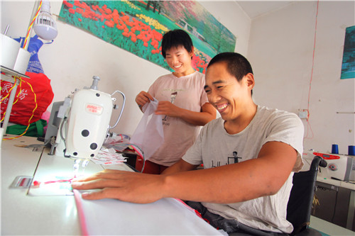 生意閑的時(shí)候,朱建舟又和妻子商量,借錢(qián)購(gòu)買(mǎi)了兩臺(tái)縫紉機(jī),幫助附近一家工廠(chǎng)加工環(huán)保袋。加工活雖然不累,但對(duì)于雙腿殘疾的朱建舟來(lái)說(shuō)卻很困難。一向愛(ài)動(dòng)腦筋的朱建舟自己動(dòng)手把縫紉機(jī)踏板改裝成手動(dòng)式的,大大提高了工作效率。“一個(gè)月能掙2000多元錢(qián),還能顧家,照顧病人和孩子。”王五妮心里有說(shuō)不出的高興。