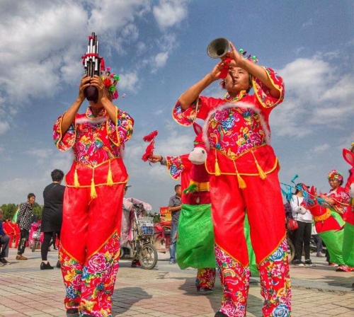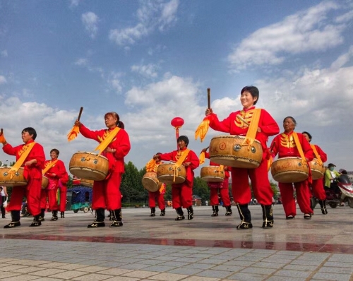 廣場上,一排排碩大的紅氫氣球高懸,氣球下縣掛著祝賀農(nóng)民豐收節(jié)的標(biāo)語。穿著各種鮮艷顏色的表演服裝的民間藝術(shù)表演隊,給節(jié)日增光添彩,擂響盤鼓,為節(jié)日助威。從全縣23個鄉(xiāng)鎮(zhèn)起早趕來的46支民間藝術(shù)表演隊伍,伴隨著悠揚的音樂,喧天的鑼鼓在廣場上各顯其能。腰鼓、盤鼓、耍獅子、劃旱船、抬花轎、挑花籃、廣場舞也以不同的方式表達著豐收的喜悅。