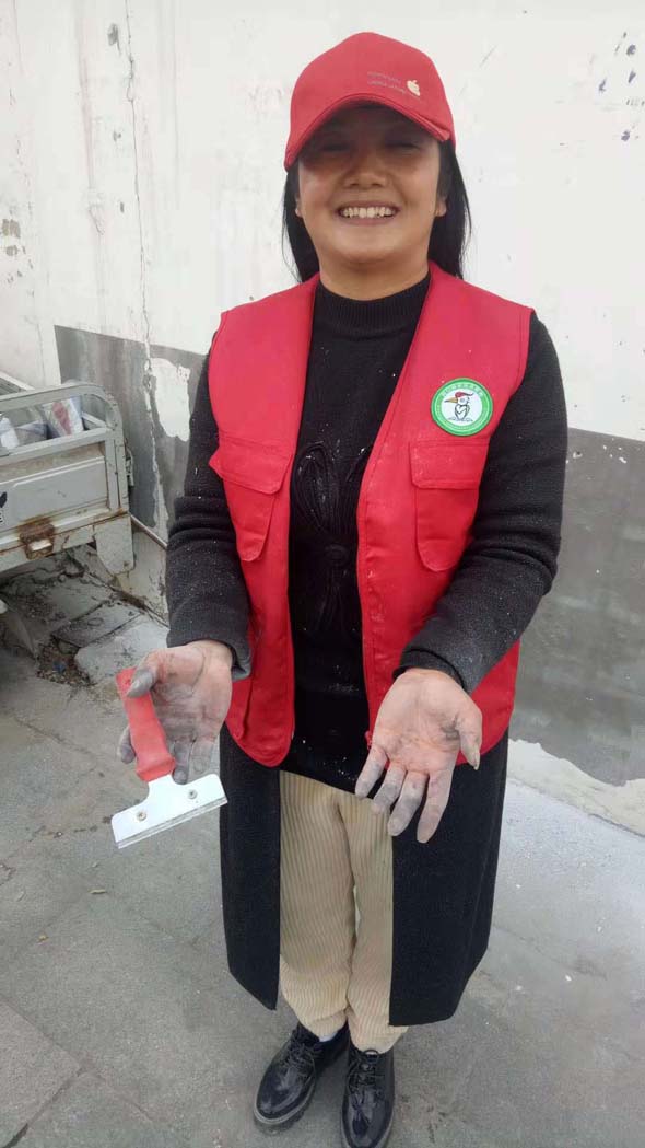 周口市啄木鳥志愿者服務工作委員會臨時黨支部書記、周口市慈孝文化促進會會長孫彩云更是不怕臟,不怕累,連個手套都不帶,直接用雙手拿著鏟刀或者抹布清理墻上的小廣告,最后弄得雙手和滿身都是污漬?!盀榱宋覀兊某鞘懈粒鳛橐幻驹刚?,就應該不怕累,不怕苦?!?/p>