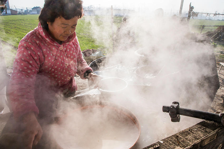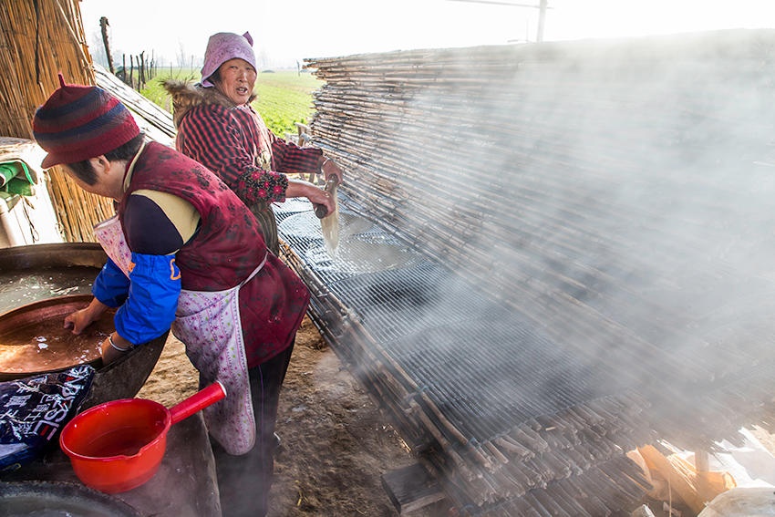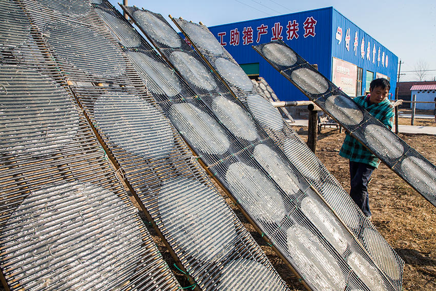 寒冬,河南省沈丘縣付井鎮(zhèn)楊莊村子里,一個(gè)個(gè)制作粉皮的工棚里爐火正旺,熱氣騰騰的大鍋里漂出一張張粉皮。田野中,到處是晾曬粉皮的場景,真是難得一見。
