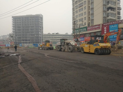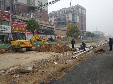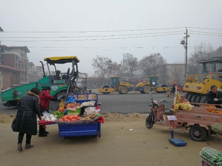 記者今日走訪漢陽路中段(穎河路-建設(shè)路)看到,目前該路段機動車道已鋪上黑色的混凝土物質(zhì),人行道則是壓實過的土路。壓路機等設(shè)備停靠在道路兩頭,并未啟動,有兩臺挖掘機及數(shù)十名工人在人行道上,鋪設(shè)下水道。施工路段內(nèi),有不少菜販在沿街叫賣。